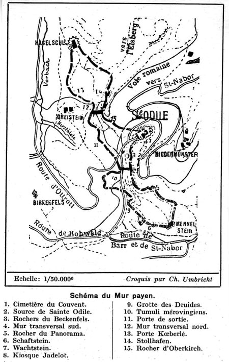 Le Mur payen ou Heidenmauer, d'un développement de 10 km. 500, encercle dans son enceinte trois plateaux contigus, mais bien distincts : la Bloss au sud, une partie de l'Elsberg au nord et entre les deux le plateau de Sainte-Odile proprement dit, soit une superficie totale de plus de cent hectares. L'espace ainsi circonscrit forme une crête de forme bizarre, un ovale irrégulier, très allongé du nord au sud, long de trois kilomètres [Note : La plus grande longueur en ligne droite, du Ménelstein au Hagelschloss, les deux points extrêmes, est de 3.070 m. — Un bon sentier permet de longer le Mur dans ses parties les mieux conservées] sur une largeur qui varie entre 100 et 700 mètres. Deux murs transversaux séparent les trois plateaux, qui ainsi formaient comme autant d'enceintes indépendantes ou de camps retranchés ; on retrouve nettement la trace de ces deux murs de séparation à la hauteur du Stollhafen et vers le Beckenfels, à quelques pas du Banc Herrade.